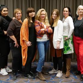 Från vänster: Elin Lindsmyr, Kvinnojouren i Motala, Adine Samadi, Kvinnojouren Iris i Luleå, Gunvor Söderberg, Kvinnojouren i Mark (kassör), Svenljunga och Tranemo, Emelie Skeppar, Kvinnojouren Iris i Luleå, Caroline Högstedt, Alla Kvinnors Hus i Karlstad, Maja Ahrman, Stockholms tjejjour (vice ordförande), Jenny Westerstrand, Haninge kvinnojour (ordförande), Elisabeth Lindgren Edh, Kvinnojouren på Österlen, (Simrishamn), Liselotte Falk, Kvinnojouren Frideborg i Mölndal/Härryda. Foto: Ghita Huldén.