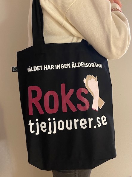 På kassen finns Roks tjejjourers logga och budskapet Våldet har ingen åldersgräns.