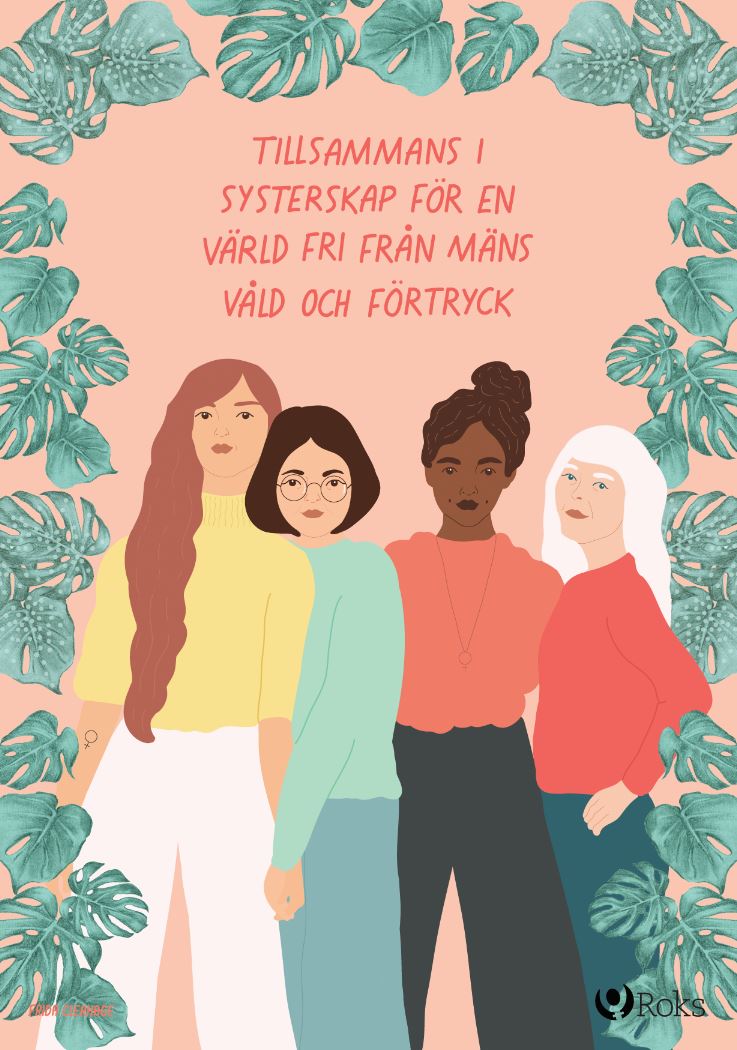 Ett vykort med Roks vision "Tillsammans i systerskap för en värld fri från mäns våld och förtryck" illustrerat. Vykortet är i storlek A5.
